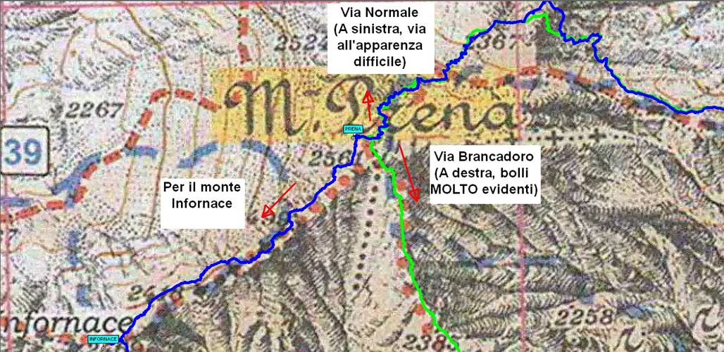 Dal Monte Infornace si scende per una cinquantina di metri lungo uno stretto sentiero a filo di cresta per poi risalire ripido verso il Prena. Un ripido salto di rocce deve essere superato e la corda fissa che aiutava nella salita è molto danneggiata e NON ci si può fare affidamento. Superato l’ostacolo si prosegue su fondo roccioso a tratti sdrucciolevole. Conviene camminare sui tratti di roccia, molto più stabili.