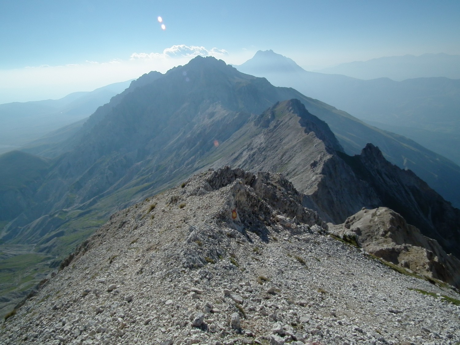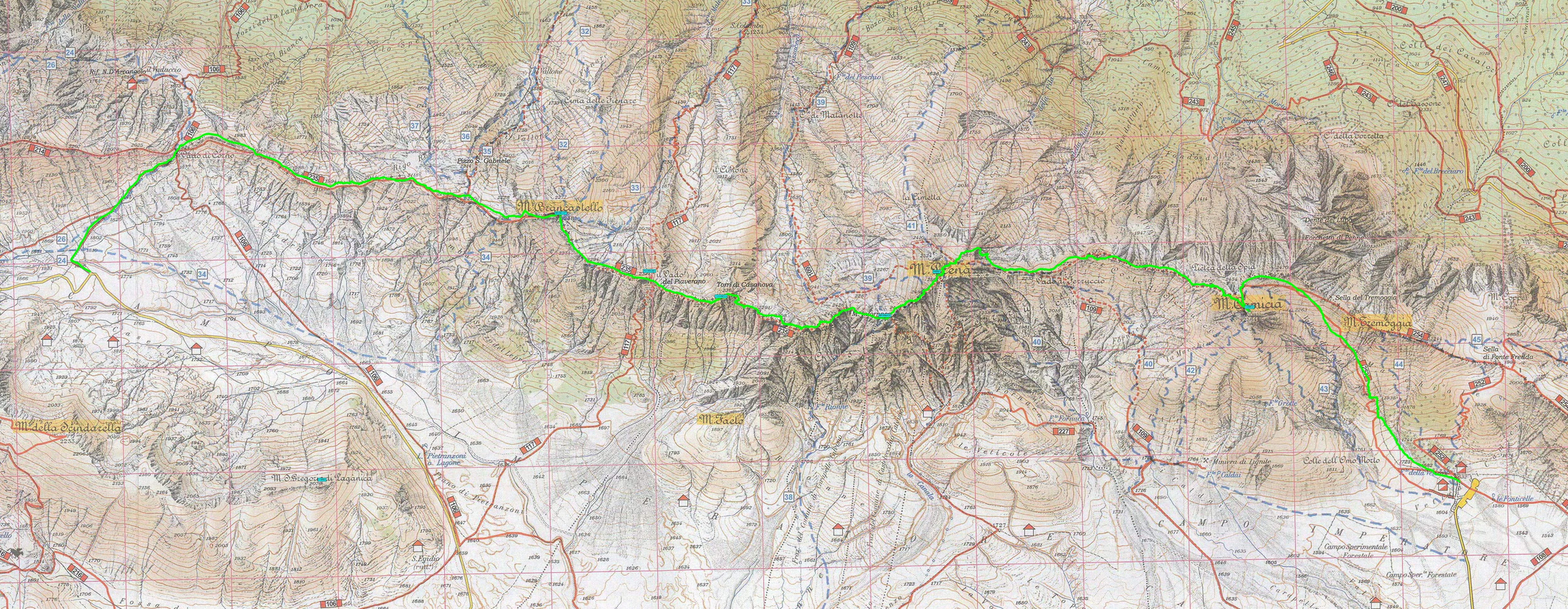 Il Sentiero del Centenario Il Sentiero del Centenario Il sentiero del Centenario è stato inaugurato nel 1974 dal CAI di L’Aquila per festeggiare appunto il loro centesimo compleanno. È una traversata lunga e impegnativa riservata ad escursionisti bene allenati, che non hanno problemi di vertigini e che sono in grado di mettere le mani sulla roccia per affrontare alcuni tratti attrezzati. Esso si snoda lungo la cresta orientale del Gran Sasso partendo dal Vado di Corno per arrivare fino al rifugio di Fonte Vetica. I numeri di questo sentiero danno solo una vaga idea della sua durezza. Questo è un percorso che ogni appassionato del Gran Sasso prima o poi vuole e deve affrontare ma che non va assolutamente sottovalutato.Il notevole dislivello, sia in salita che in discesa, è distribuito in numerosi e impegnativi saliscendi lungo la cresta. Questo fa si che non si possa prendere un ritmo di marcia continuativo e riposante. Le salite ripide si alternano alle discese e si fatica a trovare un equilibrio nel passo da tenere. Il percorso non offre nessun riparo e, d’estate, il sole picchia duro su queste montagne. Tre litri di acqua sono il minimo per affrontarlo. L’unica fontana si trova all’arrivo a Fonte Vetica. Dalle Torri di Casanova fino alla vetta del Monte Camicia si deve spesso mettere le mani sulle rocce e alla fatica fisica si aggiunge lo stress nervoso per affrontare tratti spesso esposti che richiedono la massima concentrazione fino alla chicca finale: la lunga e faticosa discesa dal Monte Camicia fino a fonte Vetica, su un terreno duro e sassoso, che arriva a gambe ormai cotte e da il colpo di grazia all’escursionista ormai provato dalla lunga camminata. Ed è proprio nel tratto finale della salita al Camicia che si trova uno dei tratti più insidiosi del percorso: un ripido canalino dove bisogna arrampicarsi su roccia marcia e inaffidabile. Ogni passo va misurato e ogni appiglio attentamente studiato, prima di farci affidamento per la progressione. Inoltre la parte iniziale, dove si accumulano i sassi che continuamente arrivano dall'alto, ormai è sempre più ingombra di ghiaia, la quale rende alquanto difficoltoso l'attaco della via. Nella mia esperienza di escursionista ho fatto questo percorso già quindici volte e ormai, una volta all’anno è diventato un appuntamento fisso.La prima volta è stata nel Luglio del 2007. A parte un tentativo parzialmente fallito (non siamo saliti sul Camicia ma siamo riscesi dal vado di Ferruccio per la Normale del Prena) poi l’ho sempre terminato e recentemente ho potuto finalmente affrontarlo anche in solitaria. L’esperienza mi ha insegnato che questo percorso non va affrontato alla leggera e soprattutto va preparato affrontando percorsi di uguale (o maggiore) lunghezza e dislivello. Inoltre penso che non vada affrontato con gruppi numerosi. Il numero ideale di partecipanti è quattro (per esempio due che lo hanno già fatto e due novizi). Non per niente, il tentativo fallito era con nove persone: troppe. Di queste almeno tre o quattro avevano sottovalutato eccessivamente la difficoltà del percorso, ampiamente descritta in numerosi scritti presenti su libri, guide e siti Internet. Un altro insegnamento è stato quello dei tempi di percorrenza. Il centenario richiede 7 – 9 ore per essere percorso: tempi minori si fanno con un ottimo allenamento, tempi maggiori cominciano a far rischiare un rientro “al buio” e un eccessivo affaticamento. Analizzando i tempi di percorrenza dei vari percorsi ho notato che spesso molto del tempo che si perde è nell’affrontare i passaggi più tecnici. La salita e la discesa delle torri di Casanova, i numerosi passaggi in discesa su tratti resi scivolosi dalle roccette e dai detriti, il canalino che si incontra poco prima del Camicia dove lo scorso anno abbiamo impiegato tantissimo per superarlo mentre normalmente, avendo un passo fermo e sicuro si supera in pochi minuti e via dicendo. La tabella di marcia “ideale” prevede un appuntamento a Fonte Vetica alle 6:30 per lasciare un’auto. Dopo di che si va a Vado di Corno (15 – 20 minuti di strada), ci si prepara, e si parte per le 7:00, massimo 7:30 per arrivare a destinazione intorno alle 16:00 – 17:00. Se si vuole un margine maggiore si anticipa tutto di almeno un’ora (ma personalmente non mi è mai servito). La poesia di Filippo Crudele Mappa del percorso Profilo altimetrico Tempi di percorrenza Il Centenario in tappe I Centenari fatti ... Album fotografico